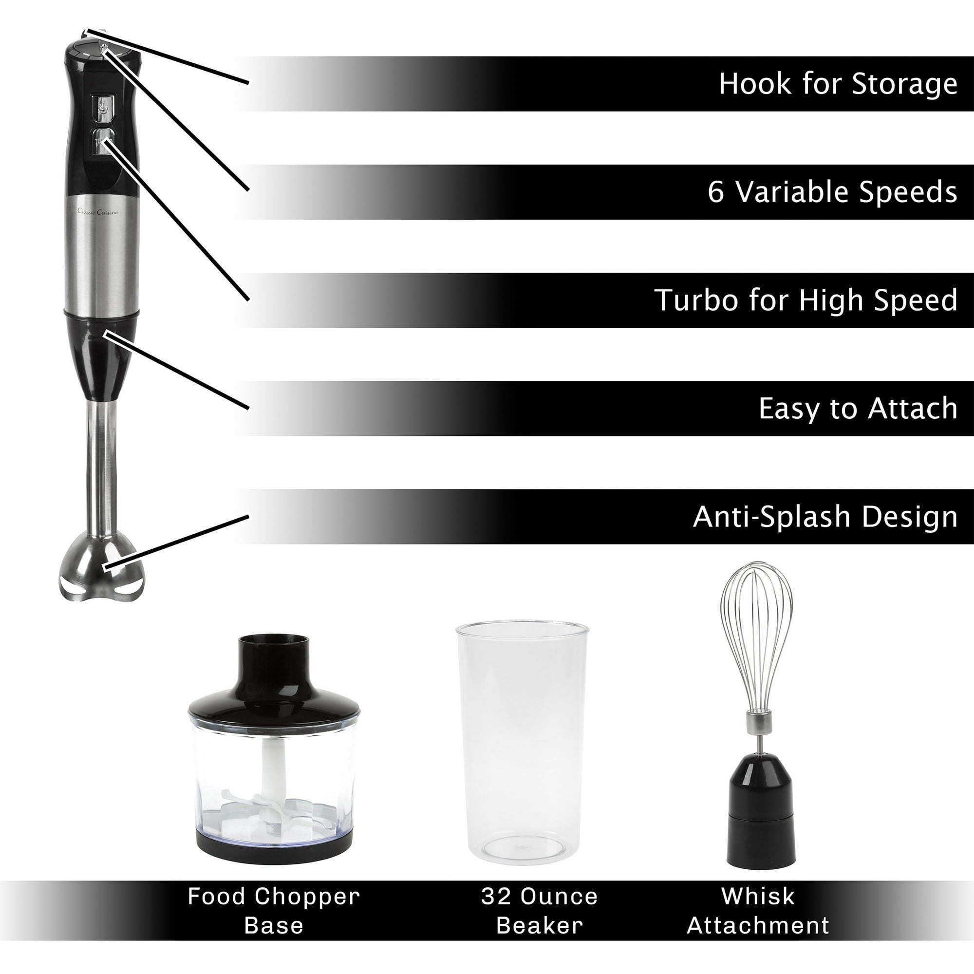 The immersion blender by classic cuisine is the handy 4-in-1 kitchen tool that every home cook should have! The hand blender comes with a whisk, 32oz capacity beaker, and food processor/chopper cup attachments that are perfect for everything from milkshakes, smoothies, meringue, and whipped cream, to baby food, salsa, guacamole, soup, pesto or potatoes; the possibilities are endless! The hand mixer features 6 different speeds as well as a turbo power high speed, while the anti-splash design means you won't have to worry about a mess, no matter the setting. With a convenient hook for storage and a compact silhouette, this easy-to-use accessory is a great addition to any kitchen.